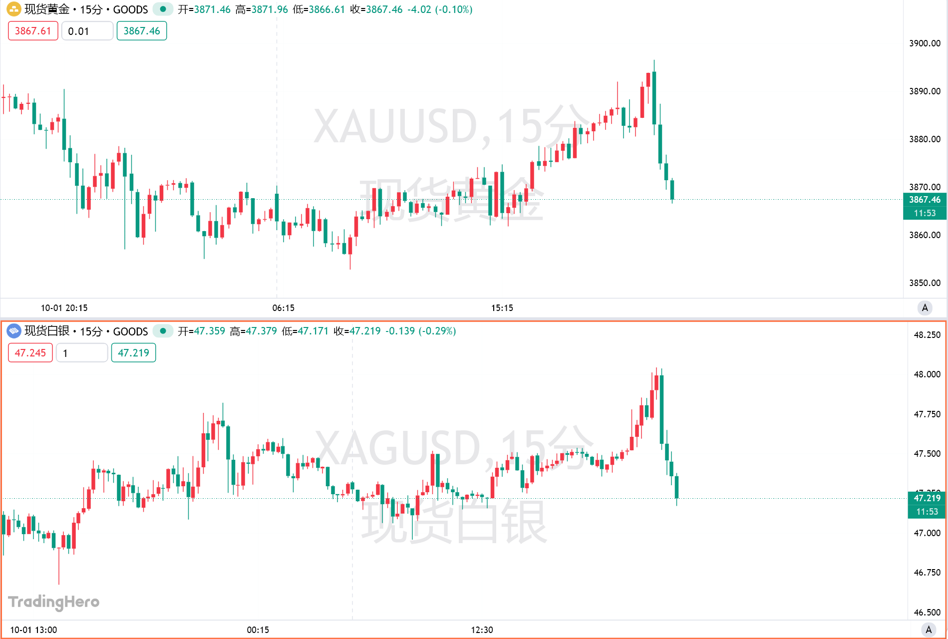由于美国政府关门,且私营部门就业数据疲软,交易员加大对美联储降息的押注,现货黄金周四盘中再度站上3890关口,但随后持续回落,较日高跌超30美元;现货白银盘中站上48美元/盎司,续创2011年5月来新高,此后跟随黄金走低,抹去日内涨幅。